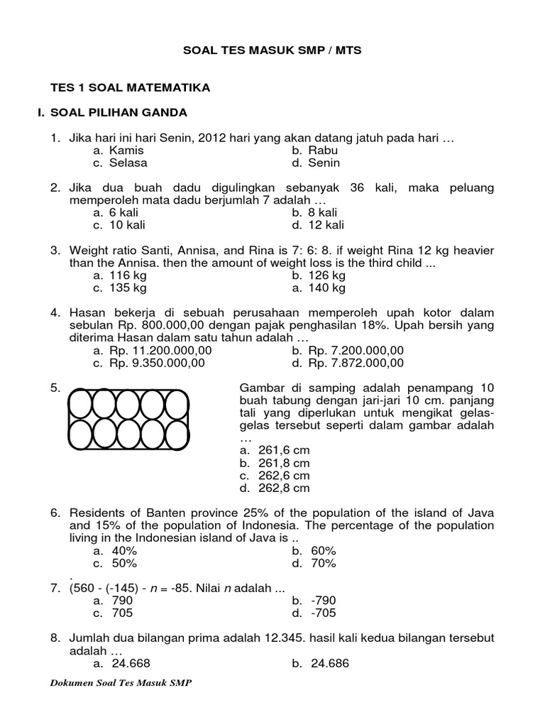 Soal Psikotes from imgv2-2-f.scribdassets.com Soal latihan dan pembahasan tes masuk sma smk man. May 31, 2017 · soal dan pembahasan tes (seleksi) masuk smp (mts) tahun 2018 (bind) berikut contoh soal tes (seleksi) masuk smp tahun 2019/2020 untuk mata pelajaran atau materi bahasa indonesia 1. Telah terjual lebih dari 147. Berikut ini adalah kumpulan berkas file guru tentang contoh soal psikotes untuk masuk mtsn yang bisa anda unduh secara gratis dengan menekan tombol download. Contoh soal tes masuk smp 2017 2018 ini merupakan contoh soal terbaru buat adik adik yang berencana masuk ke smp favorit tahun ini. Soal tes masuk smp / mts tes 1 soal matematika i. Diharapkan dengan adanya soal psikotes masuk smp favorit ini bisa membantu mengukur tingkat kecerdasan, bakat dan minat. Kumpulan contoh soal tes mutasi pns terbaru dikdasmen.